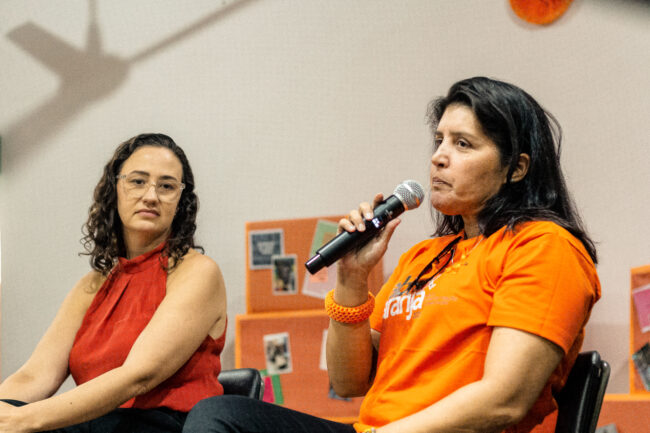 Ao lado da nutricionista Priscila Vogel, a fisioterapeuta Alessandra Neves, responsável pelo Setor de Amputados da Pestalozzi, fala durante o evento