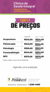 A fonoaudiologia também custa R$ 45 a sessão, com pacote de cinco atendimentos por R$ 170.